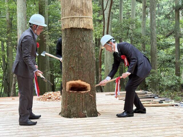 本日、朝から揖斐川町谷汲名礼の天皇林(第39回全国育樹祭お手入れ行事会場)にて「全国育樹祭10周年記念行事 ぎふ木游館サテライト施設整備伐採式」が行われ、江崎岐阜県知事もお越しになりました。そして、私も斧入れをさせていただきました。