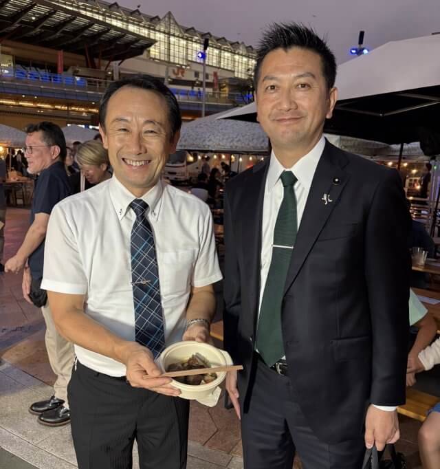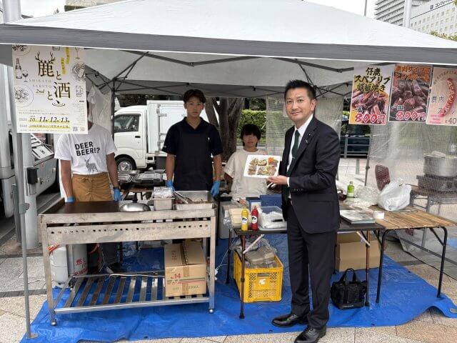 その後、岐阜駅前で今日から13日(月)まで開催されているジビエイベント「鹿と酒と」に伺い、県内の出店されているジビエ事業者の方々と意見交換をさせていただき、こちらにも江崎知事がお越しくださいました。