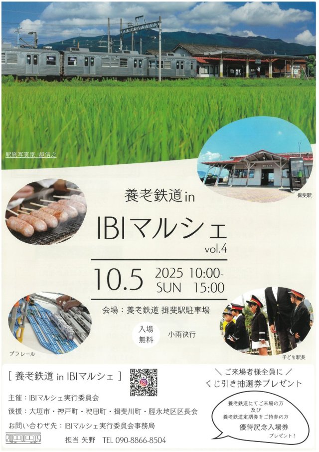 2025.09.30 IBIマルシェが開催されます 令和7年10月5日(日)に、揖斐川町の養老鉄道揖斐駅駐車場にてIBIマルシェが開催されます。 開催時間は10:00から15:00です。 ぜひ、お越しください。
