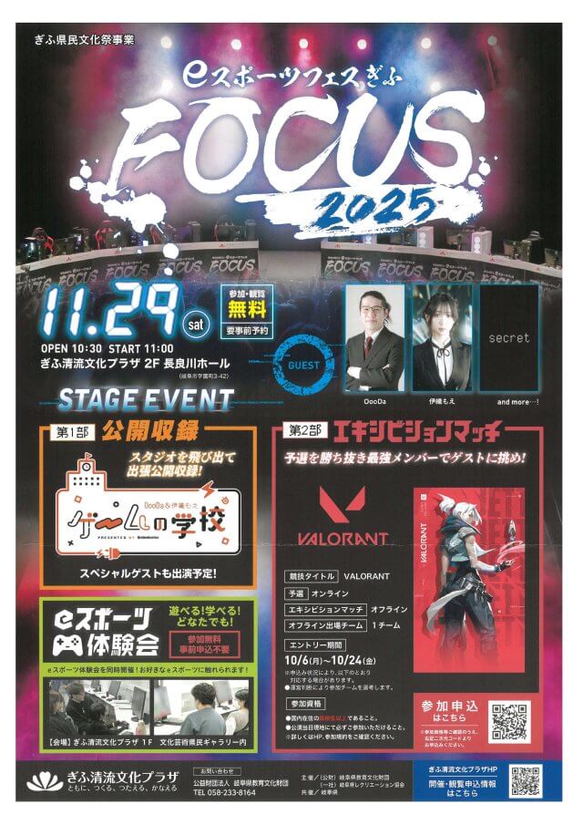 2025.11.20 「eスポーツフェスぎふ FOCUS 2025」が開催されます 令和7年11月29日(土)に、 ぎふ清流文化プラザ 2F 長良川ホールにて「eスポーツフェスぎふ FOCUS 2025」が開催されます。 ぜひお越しください。
