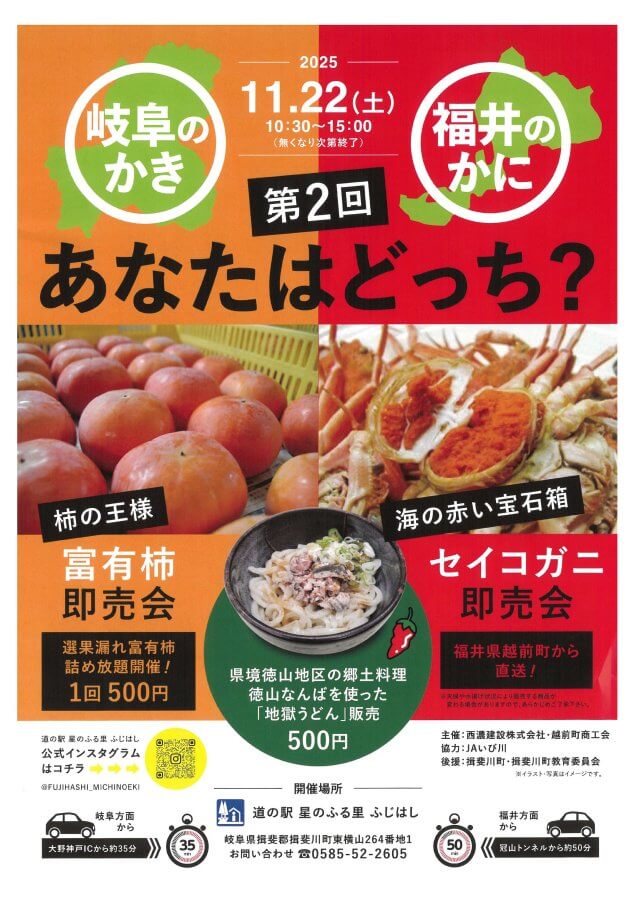 2025.11.20 「第2回 岐阜のかき 福井のかに」イベントが開催されます 令和7年11月22日(土)に、 道の駅 星のふる里 ふじはしにて「第2回 岐阜のかき 福井のかに」イベントが開催されます。 ぜひお越しください。